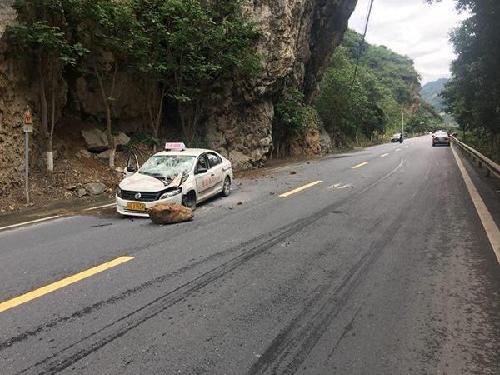????14日下午2點(diǎn)多,一名教練帶著學(xué)員在山間練車,突然遇到落石。所幸沒(méi)有人員傷亡,所有人都逃出了車外。