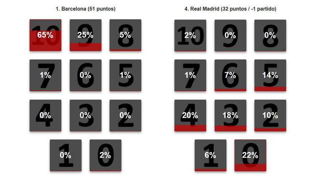 在《馬卡報(bào)》做的一系列民意調(diào)查中,球迷們?yōu)楦髦蜿?duì)和球員進(jìn)行了打分和投票。結(jié)果顯示有65%的球迷認(rèn)為巴薩的半程表現(xiàn)可以打滿分10分。而有22%的球迷為皇馬打的是1分的最低分。