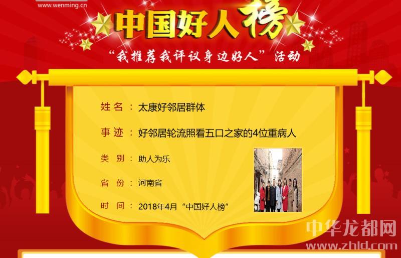 中華龍都網訊(周口報業(yè)全媒體記者 馬治衛(wèi))4月28日上午,4月中國好人榜發(fā)布儀式暨全國道德模范與身邊好人現(xiàn)場交流活動在天津市和平區(qū)舉行。太康縣“好鄰居群體”榮登4月份中國好人榜。