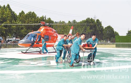 中華龍都網(wǎng)訊 6月28日上午,全市“防災減災立體救援”航空醫(yī)療救援啟動儀式在周口協(xié)和骨科醫(yī)院啟動??罩芯o急救援一小時內(nèi)全省到達。圖為直升機救援演練現(xiàn)場。