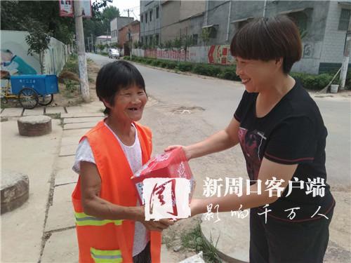 上午10時(shí)許,欣中基清潔公司經(jīng)理張志宏來(lái)到邵寨行政村??吹铰访娓筛蓛魞簦芨吲d。除了例行巡視,張志宏此行還有一項(xiàng)任務(wù):向每位保潔員發(fā)放一件飲料。“天氣持續(xù)高溫,保潔員們露天辛勤勞動(dòng),給村民們創(chuàng)造了良好的生活環(huán)境。因此,公司決定開(kāi)展慰問(wèn)活動(dòng)。”接過(guò)飲料,邵天錄等6名保潔員滿臉笑容地連聲道謝。