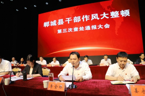 8月15日下午,鄲城縣召開(kāi)干部作風(fēng)大整頓第三次查處通報(bào)大會(huì)。貫徹全市干部作風(fēng)大整頓查處通報(bào)會(huì)議精神和縣委十二屆四次全會(huì)暨縣委工作會(huì)議精神,通報(bào)典型案例,宣布處理決定,傳導(dǎo)工作壓力,夯實(shí)工作責(zé)任,為進(jìn)一步推進(jìn)各項(xiàng)工作任務(wù)落實(shí)、打好打贏脫貧攻堅(jiān)戰(zhàn)提供堅(jiān)強(qiáng)有力的作風(fēng)保障??h委書(shū)記羅文閣發(fā)表講話,縣長(zhǎng)李全林主持。全縣副處級(jí)以上領(lǐng)導(dǎo)干部和縣、鄉(xiāng)、村各級(jí)各部門(mén)負(fù)責(zé)人參會(huì)。