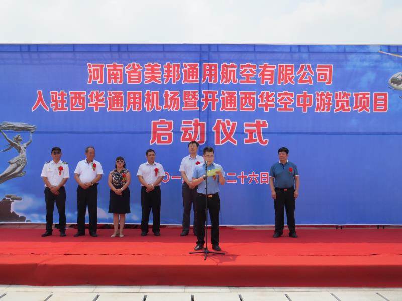 8月26日,河南省美邦通用航空有限公司入駐西華通用機場暨開通西華空中游覽項目啟動儀式在西華縣南廣場舉行,西華縣委常委、常務(wù)副縣長王獻(xiàn)超,西華縣人大常委會副主任龐友敬,西華經(jīng)開區(qū)管委會主任宋廣良,西華經(jīng)濟技術(shù)開發(fā)區(qū)城市投資有限公司總經(jīng)理朱洪江;美邦控股集團總經(jīng)理、河南省美邦通用航空有限公司董事長王洪濤等出席啟動儀式。