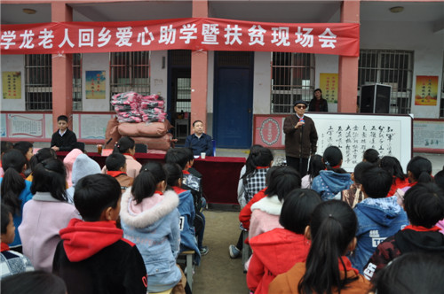 瑟瑟寒風抵擋不住火熱愛心,毛毛細雨阻擋不了赤子情懷。愛心助學現(xiàn)場,于學龍不顧高齡,除了給孩子們送去愛心禮物之外,還站在雨中分享了自己的成長經(jīng)歷,教育孩子們要學會刻苦、學會拼搏,還要懂得感恩和奉獻。