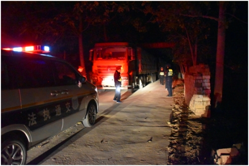 當日22時40分,該所副所長楊春風同志帶領兩個執(zhí)法中隊,對縣區(qū)域內(nèi)重點路段24小時不間斷巡查,在巡查到轉(zhuǎn)樓鄉(xiāng)通往龍曲鎮(zhèn)的X001線時,發(fā)現(xiàn)4輛大型超限車輛,其中3輛為“百噸王”,1輛為嚴重超載標掛。司機為抗拒檢查,鎖閉車門遠處觀望,我執(zhí)法人員堅守執(zhí)法現(xiàn)場,并及時調(diào)用拖車支援,另指派執(zhí)法人員與司機溝通,在動之以情、曉之以理的講解治超政策下,得到了司機的主動配合,把車輛暫扣至超限車輛卸載點。