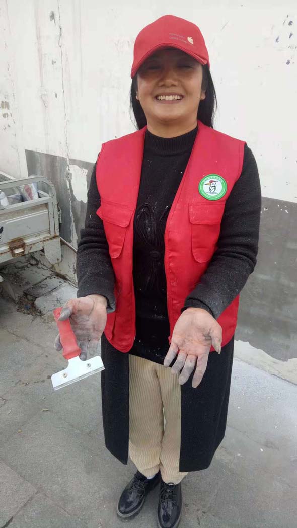 周口市啄木鳥志愿者服務(wù)工作委員會(huì)臨時(shí)黨支部書記、周口市慈孝文化促進(jìn)會(huì)會(huì)長(zhǎng)孫彩云更是不怕臟,不怕累,連個(gè)手套都不帶,直接用雙手拿著鏟刀或者抹布清理墻上的小廣告,最后弄得雙手和滿身都是污漬?!盀榱宋覀兊某鞘懈粒鳛橐幻驹刚?,就應(yīng)該不怕累,不怕苦。”