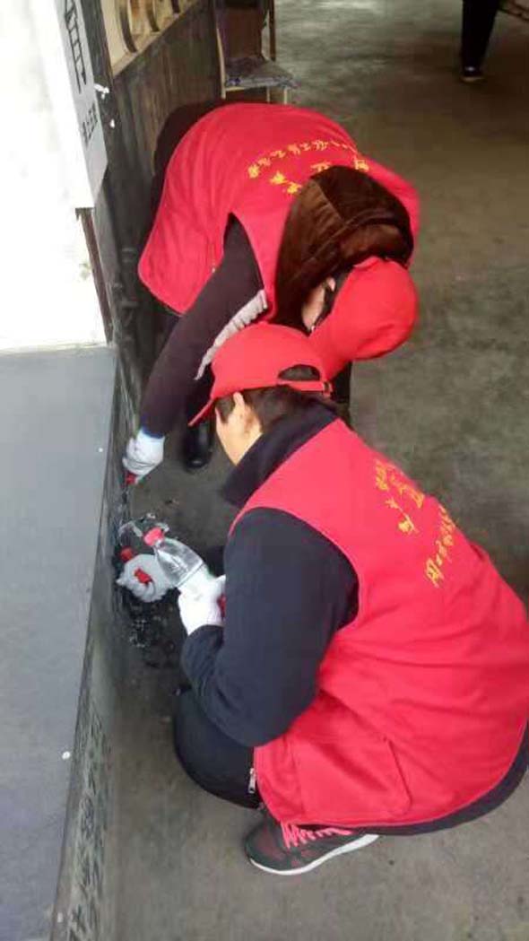 為了加快清理的速度,有的志愿者兩兩搭班,一個(gè)人用瓶裝水噴在小廣告處,另一個(gè)則趕忙用抹布進(jìn)行擦拭。別小瞧這些小廣告,清理起來很費(fèi)時(shí)、費(fèi)力,有時(shí)候一個(gè)小廣告需要花費(fèi)五、六分鐘的時(shí)間才能清理干凈,讓人累的手臂酸麻。