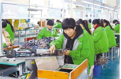 近年來(lái),沈丘縣凱旺電子公司先后在石槽集鄉(xiāng)、馮營(yíng)鎮(zhèn)、付井鎮(zhèn)等9個(gè)鄉(xiāng)鎮(zhèn)設(shè)立了27個(gè)扶貧車(chē)間,吸納了700多人就業(yè),其中包括160名貧困群眾,人均月工資為2000至3000元。圖為扶貧車(chē)間里的生產(chǎn)場(chǎng)景。
