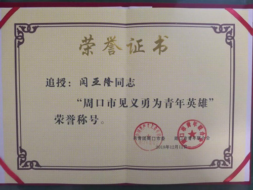 12月13日,記者從鄲城縣團(tuán)縣委獲悉,為表彰閆亞隆同志的英雄事跡,引導(dǎo)和激勵全市廣大團(tuán)員青年學(xué)習(xí)他的崇高品格,共青團(tuán)周口市委、周口市青年聯(lián)合會追授閆亞隆同志“周口市見義勇為青年英雄”稱號。