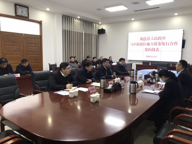 12月17日,鹿邑縣人民政府與中原銀行地方債券發(fā)行合作簽約儀式舉行??h委常委、常務(wù)副縣長陸志杰,老子學(xué)院黨組副書記、交通局局長王初立,中原銀行周口分行黨委副書記、副行長周朝陽出席簽約儀式。縣財政局、教體局、住建局、林業(yè)局、發(fā)改委、老子文化產(chǎn)業(yè)園及投資公司等相關(guān)單位負(fù)責(zé)同志參加會議。