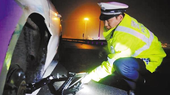 當日21時許,市公安局交通管理支隊七大隊民警王凱偉和同事巡邏至機西高速129公里周口方向時,發(fā)現(xiàn)一輛白色福特轎車停在應(yīng)急車道上,車輛后方擺放有警示標志,一男子蹲在車旁不知所措。見狀,王凱偉立即安排輔警柴袁龍在來車方向做好安全防范,自己下車查看情況。