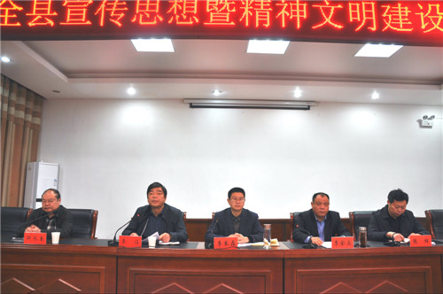 就如何做好今年的宣傳思想和精神文明建設(shè)工作,李本磊要求,要用好“學(xué)習(xí)強國”平臺,強化理論武裝;要建好新時代文明實踐中心、鄉(xiāng)村志愿服務(wù)中心、縣級融媒體中心,筑牢基層陣地;要抓好“三城兩縣聯(lián)創(chuàng)”“六村共建”“三個起來”等三項活動,普惠人民群眾;要突出工作主線,聚焦主題宣傳;要堅持團(tuán)結(jié)鼓勁,營造輿論強勢;要立足凝神聚氣,倡樹文明新風(fēng);要發(fā)揮比較優(yōu)勢,打造文化強縣;要著力增強“四力”,建設(shè)一流隊伍。