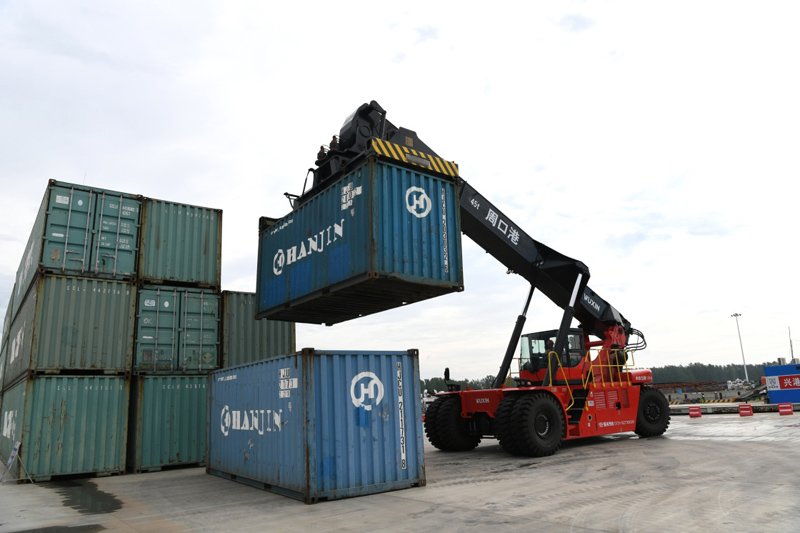 7月31日,工人在周口中心港碼頭搬運集裝箱。