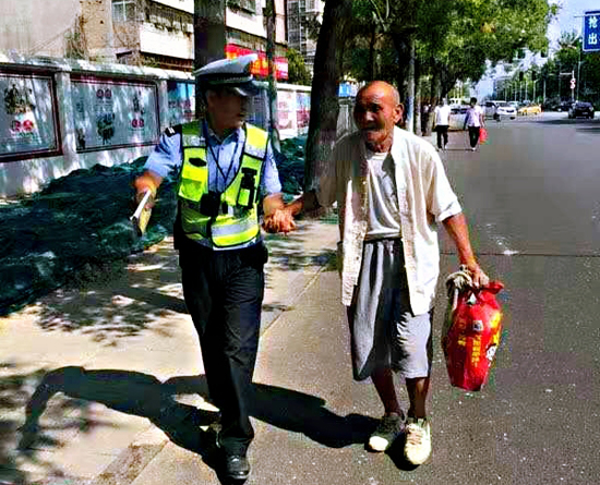 畢鵬發(fā)現(xiàn)這一情況后,立即上前攙扶老人,路過的車輛看到這一幕也紛紛停車讓行。在安全通過馬路后,老人告訴畢鵬,他找不到公交車站,無(wú)法回家。隨后,畢鵬手挽手將老人送到公交車站(如圖)。待老人安全坐上公交車后,畢鵬才回到工作崗位上。