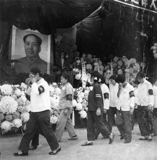 廣播喇叭一直轉(zhuǎn)播著中央人民廣播電臺的節(jié)目,哀樂一遍遍響起,回蕩在大街小巷、城鎮(zhèn)鄉(xiāng)村,大家不約而同地佩戴黑紗,自發(fā)做白花、扎花圈、寫挽聯(lián),商店里的白紙和黑布都賣缺了。機關(guān)單位的同志在自己布置起來的靈堂里悼念毛主席,學(xué)生每天上課之前都向毛主席默哀,工廠里掛起了“繼承毛主席遺志,抓革命、促生產(chǎn)”的橫幅,農(nóng)民佩戴著黑紗在田野里勞動。