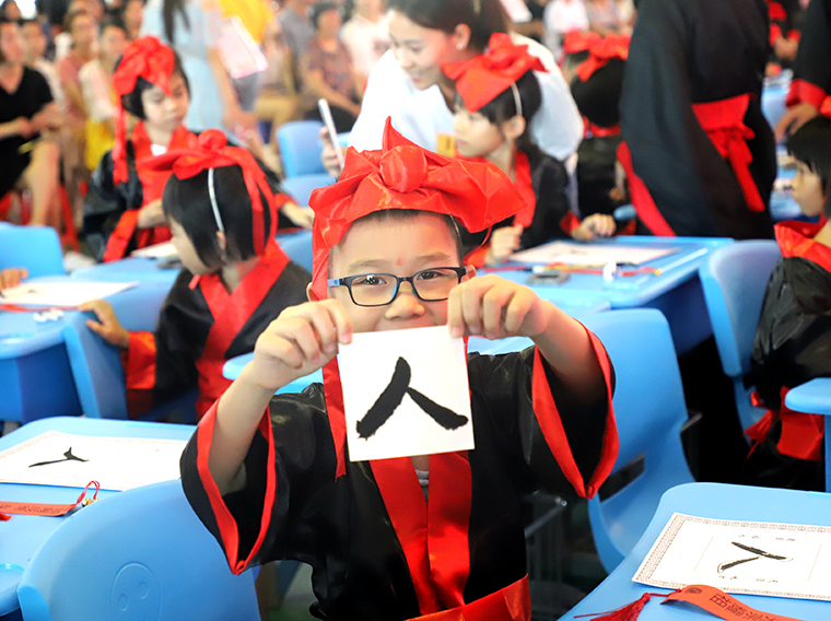 在啟蒙導師的帶領下,一年級新生寫出了簡單而意義深遠的“人”字,寓意著在人生的啟蒙階段,學會做人是最為重要的。