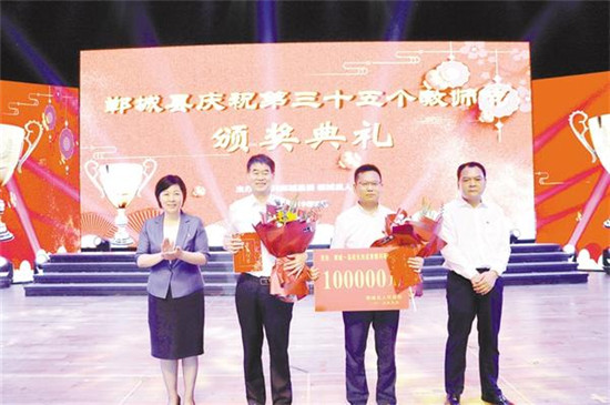 本報(bào)訊(記者 徐松 文/圖) 9月6日,鄲城縣慶祝第35個(gè)教師節(jié)頒獎(jiǎng)典禮在縣人民會(huì)堂舉行??h委、縣政府斥資600余萬(wàn)元重獎(jiǎng)教育功臣,助推鄲城教育再創(chuàng)輝煌??h委書記羅文閣、縣長(zhǎng)李全林和縣四個(gè)班子其他領(lǐng)導(dǎo),縣直各單位、各鄉(xiāng)鎮(zhèn)負(fù)責(zé)人及教育系統(tǒng)全體職工共1400余人參加頒獎(jiǎng)典禮。羅文閣、李全林為教育功臣頒獎(jiǎng)(如圖)。