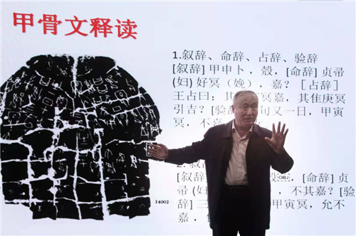 接著,在歷時兩個半小時的分享中,郝教授以融合發(fā)現(xiàn)、甲骨文字拆分、甲骨文書風及甲骨文書法創(chuàng)作為立足點,襯以個人習書作品,從文化本義的內(nèi)涵、文化本義的要素、文化的生成和甲骨文的演化和發(fā)展等方面詳細闡述了文化的來源以及人類社會進步的過程。