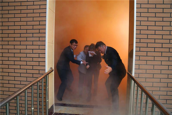 記者在現(xiàn)場看到,隨著消防警鈴的響起、煙霧的彌漫,來自物業(yè)公司和社區(qū)的數(shù)十名群眾彎著腰,同時用濕毛巾捂著口鼻,緊急而有序地從步梯撤出,與此同時,消防隊員迅速將消防水袋和槍頭同消防栓相連接,并打開消防栓對準“火勢”,一瞬間,發(fā)生在建業(yè)社區(qū)的一場“火災”被及時撲滅,現(xiàn)場圍觀的眾人爆發(fā)出陣陣掌聲。