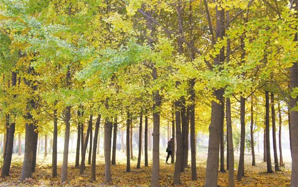 近日,周口市經(jīng)濟(jì)開發(fā)區(qū)人民廣場,金黃色的楊樹葉在陽光照耀下熠熠生輝,給城市增添一抹亮色。張振海 攝