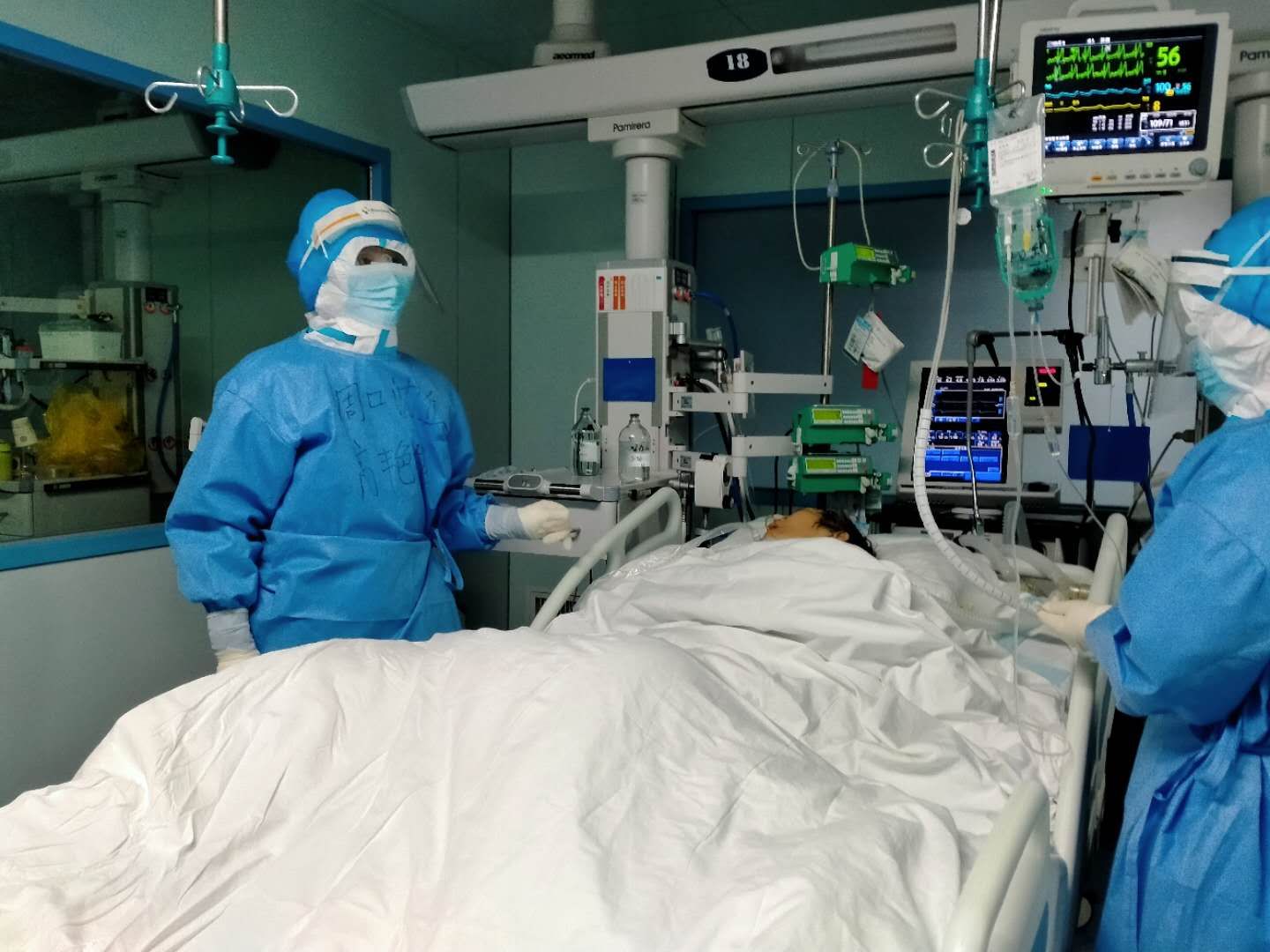 高艷艷說,除了多穿一層防護(hù)服,其他的跟平時(shí)的工作差不多。不同的地方,主要體現(xiàn)為兩點(diǎn),一就是從接班到交班,所做的所有工作都多了一份被感染的風(fēng)險(xiǎn)。二就是救治存在的難點(diǎn)多、棘手的問題多、突發(fā)事件比較多,比如說:新冠肺炎患者發(fā)展到危重期,特別是病程較長的病人,肺大多爛掉了,多數(shù)病人上有呼吸機(jī),這樣的病人極易出現(xiàn)氣胸。有一次值班期間,一位56歲的男性患者,突發(fā)氧分壓下降、煩躁、血壓下降、出汗,急查胸片證實(shí)氣胸,緊急給予了胸腔穿刺閉式引流,病人癥狀才得以緩解。氣胸雖然在臨床上很常見,但對(duì)于新冠肺炎病人卻如同雪上加霜,不緊急處理病人很快就會(huì)死掉。每一個(gè)搶救的場面如同一場激烈的戰(zhàn)場,而戰(zhàn)斗隨時(shí)會(huì)打響,但你卻根本無法預(yù)測哪一次戰(zhàn)斗會(huì)在哪一個(gè)時(shí)刻打響,所以值班時(shí)每位醫(yī)師都會(huì)慣性地緊盯著每個(gè)數(shù)值、各個(gè)參數(shù)……