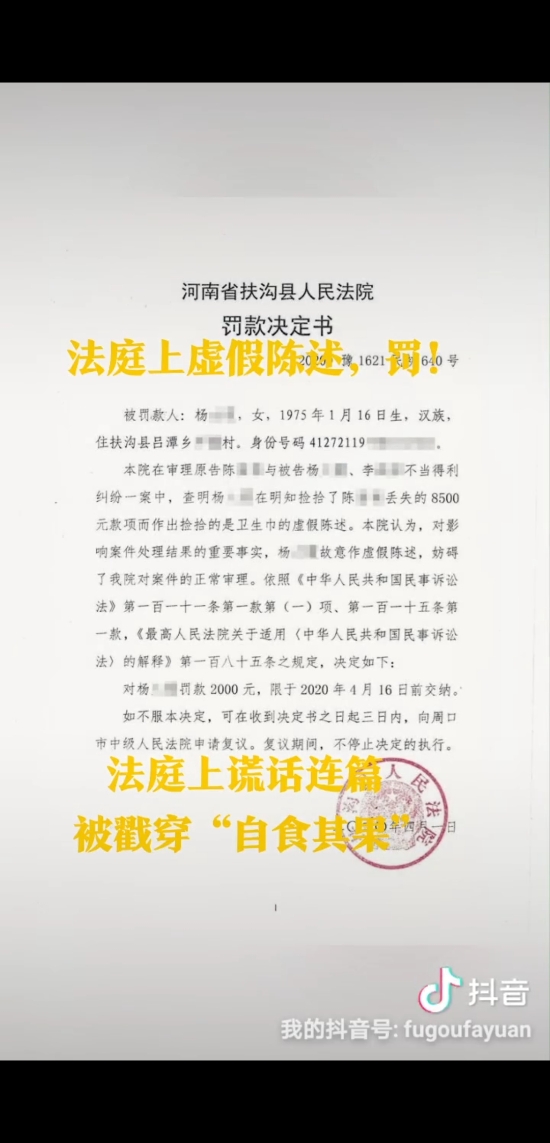 為了將撿到的8500元錢據(jù)為己有,當(dāng)事人竟然在法庭上作出虛假陳述,最終不僅被法官當(dāng)庭識(shí)破,全額返還失主,還被法院處以2000元罰款,真可謂得不償失、自食苦果。近日,針對(duì)被告楊某的虛假陳述行為,扶溝縣人民法院呂潭法庭依法作出罰款2000元的處罰決定,楊某在規(guī)定時(shí)間內(nèi)繳清了罰款。