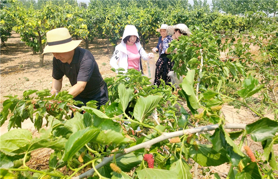 眼下正是桑葚陸續(xù)成熱的好時(shí)節(jié)。黃泛區(qū)農(nóng)場(chǎng)郭莊村鷹虎寶百畝桑椹園,一排排桑樹枝頭上,掛滿了或青或紅或紫的桑葚。紫黑桑葚放入口中,輕輕一咬,甜甜酸酸的味道瞬間在口中蔓延開來(lái),讓人忍不住想多嘗幾顆。