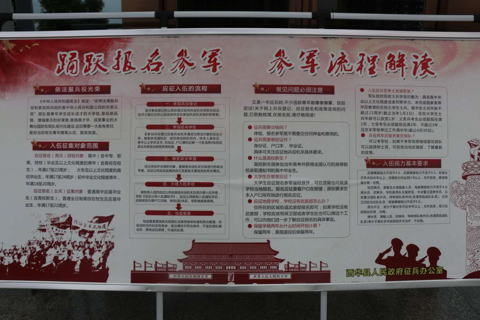 為做好大學(xué)生征兵工作,西華縣人武部認(rèn)真開展了多層次、全方位的宣傳發(fā)動(dòng)??h人武部多次召開黨委會(huì),分析大學(xué)生征兵形勢,研究制定層層宣傳發(fā)動(dòng)方案。扎實(shí)開展大學(xué)生兵員潛力調(diào)查工作,挖掘大學(xué)生兵員潛力,及時(shí)登記造冊(cè)。全縣成立了60支由縣人武部干部職工、鄉(xiāng)鎮(zhèn)專武干部、村民兵干部參加的大學(xué)生征兵宣傳小分隊(duì),分頭對(duì)轄區(qū)內(nèi)在家的各級(jí)各類院校畢業(yè)生和在校生,進(jìn)行挨家挨戶、面對(duì)面的宣傳,把《2020年西華縣大學(xué)生征兵宣傳冊(cè)》發(fā)放到每一名大學(xué)生手中,做到一人不漏。為其算好“經(jīng)濟(jì)帳”、“ 政治帳”、“ 前途帳”。把針對(duì)大學(xué)生青年制定的最新調(diào)整的優(yōu)惠政策宣傳到位,最大限度發(fā)掘大學(xué)生征集潛力。同時(shí),該縣把做深做細(xì)大學(xué)生征兵宣傳報(bào)名工作,作為完成征兵任務(wù)的重要基礎(chǔ),積極轉(zhuǎn)變思路,創(chuàng)新工作方法,靈活運(yùn)用各種宣傳手段,千方百計(jì)增強(qiáng)宣傳發(fā)動(dòng)的針對(duì)性、實(shí)效性。該部除采取散發(fā)傳單、懸掛橫幅、制作板報(bào)、張貼標(biāo)語、現(xiàn)場咨詢等傳統(tǒng)方式外,還充分利用廣播、電視、微信、短信、電子屏等傳媒手段增強(qiáng)宣傳效果,做到廣播電視里有音有像,微信短信電子屏有征兵信息滾動(dòng)發(fā)布,墻報(bào)上有文,橫幅標(biāo)語上有宣傳口號(hào),提高全民政治意識(shí)和國防觀念,切實(shí)讓大學(xué)生入伍優(yōu)惠政策宣傳不留死角。該部充分利用對(duì)現(xiàn)役軍人家庭逐戶走訪解難、贈(zèng)送懸掛“光榮軍屬”牌匾、敲鑼打鼓送喜報(bào)等活動(dòng),在全社會(huì)大力營造“一人參軍、全家光榮”的鮮明導(dǎo)向,讓尊崇軍人的號(hào)召在西華縣落地,讓當(dāng)兵光榮的傳統(tǒng)在群眾心中扎根,從而激勵(lì)大學(xué)生青年積極報(bào)名參軍的報(bào)國熱情。