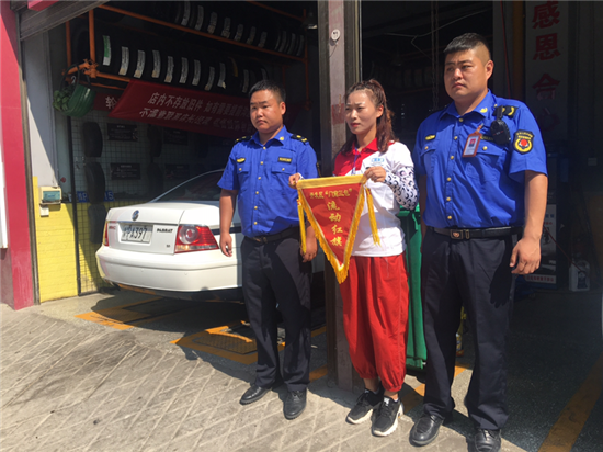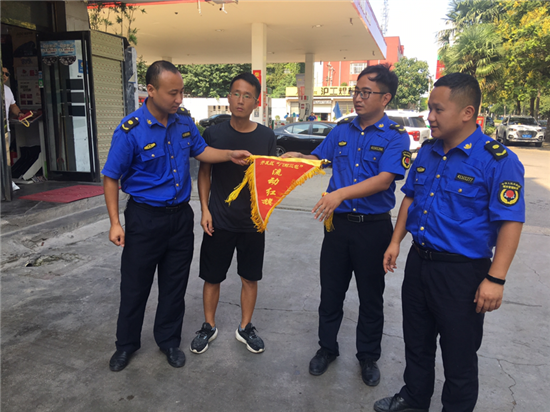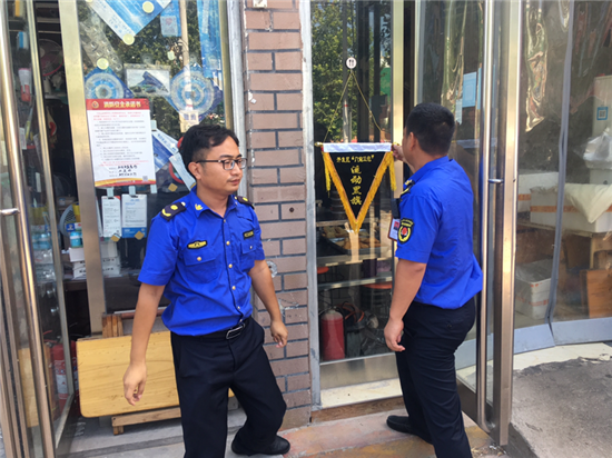夏日的陽光透過清澈的天空照下來,街很凈,樹很綠。8月18日是開發(fā)區(qū)城管稽查大隊(duì)進(jìn)行“門前三包”流動(dòng)紅旗和流動(dòng)黑旗評(píng)選的日子。開發(fā)區(qū)城管稽查大隊(duì)工作人員根據(jù)綜合評(píng)比標(biāo)準(zhǔn),分別為“門前三包”工作突出的門店懸掛流動(dòng)紅旗,為“門前三包”工作不力的門店懸掛黑旗。