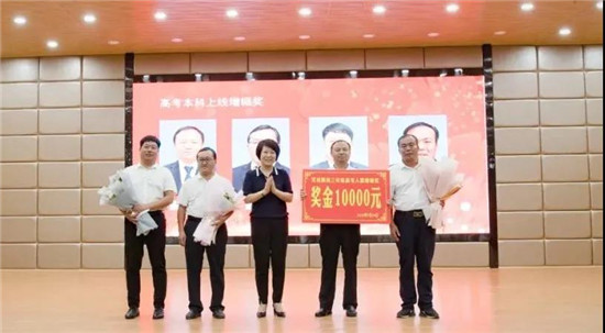 與會領導為40名本科上線增幅獎、標兵教師、新銳獎、優(yōu)秀學科組等獲獎教師代表頒獎、獻花,并合影留念。