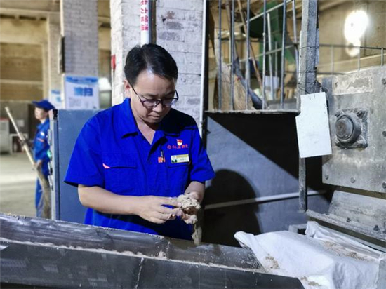 9月17日上午,大河網(wǎng)記者在河南仰韶酒業(yè)有限公司的制曲車(chē)間看到,曲磚生產(chǎn)線正在緊張生產(chǎn),張振科抓起傳送帶上的原料進(jìn)行擠壓,查看原料的水分度和粉碎度。和生產(chǎn)線的工人交流后,張振科又和徒弟來(lái)到曲庫(kù),分別拿起半塊曲磚,放到鼻子下,深深吸氣,嗅聞曲磚的曲香。