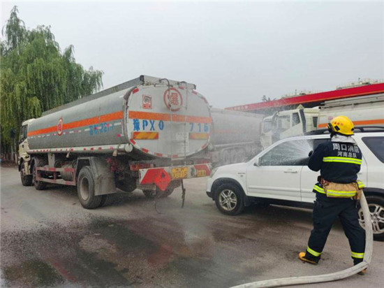 當(dāng)日上午10時(shí),商水交警大隊(duì)指揮中心接到報(bào)警:在商水縣興商大道與陳勝大道交叉口西、湯莊油庫處,一輛轎車與一輛?;饭捃囎肺蚕嘧?,正常罐體損壞,?;沸孤镀鸹穑I車駕駛室變形,駕駛?cè)吮焕к噧?nèi),如不及時(shí)救援,駕駛?cè)擞猩kU(xiǎn),另外因事故現(xiàn)場臨近湯莊油庫,如不及時(shí)處置可能發(fā)生爆炸,后果不堪設(shè)想。
