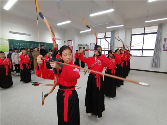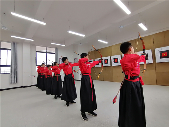 在皮營(yíng)學(xué)?;顒?dòng)室,學(xué)校舞蹈社團(tuán)的小朋友展示了傳統(tǒng)儀式《鹿鳴》,深情的演繹,展示了他們對(duì)國(guó)學(xué)經(jīng)典的理解。禮射是禮樂(lè)文明重要組成部分,習(xí)射先習(xí)禮,射以觀德。習(xí)射可以強(qiáng)健體魄,其中還蘊(yùn)含了眾多古人先賢的智慧。皮營(yíng)學(xué)校禮射興趣班的小朋友進(jìn)行禮射表演,隨著挾矢,正筈,審固,舉弓,引彀,發(fā)矢,斂弓,執(zhí)弦等一系列指令,拈弓搭弦展示禮射八法。在這里,學(xué)生們通過(guò)不同方式的展示,詮釋自己對(duì)“禮”“樂(lè)”的理解和認(rèn)知。