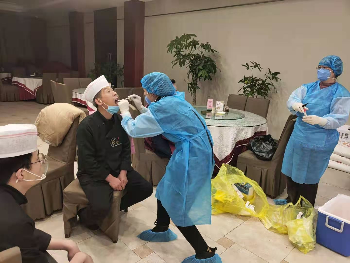 為助力第一屆周商大會圓滿成功,市衛(wèi)生健康委抽調(diào)近百名調(diào)精兵強將組成衛(wèi)生保障專班開展衛(wèi)勤保障工作。圖為工作人員在市委黨校迎賓館和體育賓館餐廳對后廚人員做核酸檢測及開展冷鏈?zhǔn)称废尽?/p>