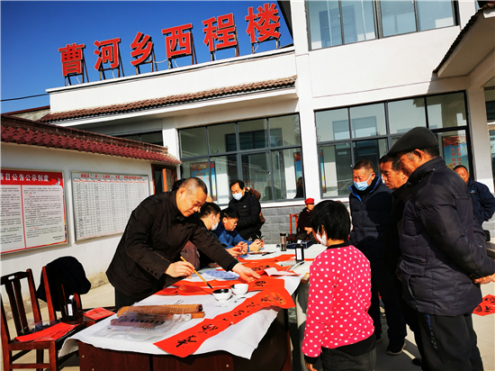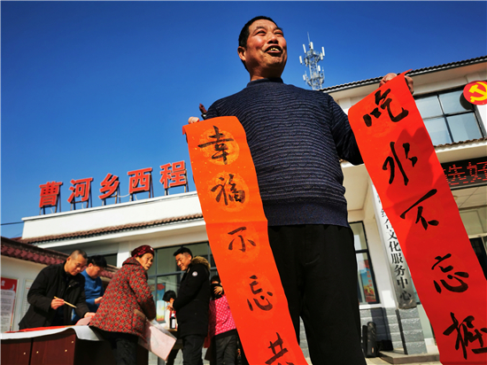 “吃水不忘掘井人,幸福不忘共產(chǎn)黨"。1月30日上午,在淮陽(yáng)區(qū)曹河鄉(xiāng)程樓村,村民孫訓(xùn)濤領(lǐng)到春聯(lián)后邊念邊樂(lè),脫貧后的幸福生活溢于言表。當(dāng)天,淮陽(yáng)區(qū)文聯(lián)組織書(shū)法家下鄉(xiāng)義寫(xiě)春聯(lián),受到群眾熱烈歡迎。