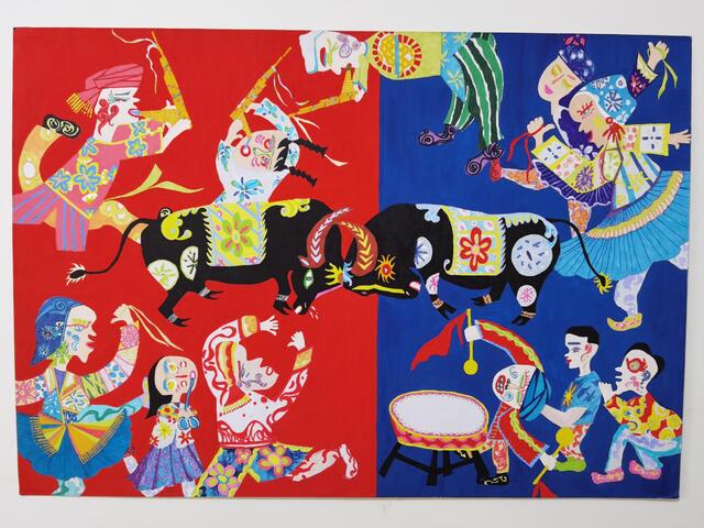 2020年4月,錢(qián)玉燕無(wú)意中看到“決勝全面小康”第二屆全國(guó)農(nóng)民畫(huà)展覽征稿啟事,對(duì)農(nóng)村生活非常熟悉的她決定一試。她立足于周口平原農(nóng)區(qū)的特色,深深領(lǐng)悟周口幾千年來(lái)的農(nóng)耕文化,對(duì)參賽作品進(jìn)行了認(rèn)真、系統(tǒng)地構(gòu)思,最終決定以歡慶豐收的斗牛活動(dòng)為題材,把農(nóng)耕文化的深遠(yuǎn)、厚重與豐富的藝術(shù)表現(xiàn)手法相融合。她采用普通的繪畫(huà)卡紙,運(yùn)用多種繪畫(huà)顏料,充分借鑒漢畫(huà)藝術(shù),吸收中原地區(qū)的剪紙文化、西方藝術(shù)大師畢加索立體畫(huà)派的藝術(shù)風(fēng)格和古埃及畫(huà)的靈感,以艷麗的紅、藍(lán)為主背景,采取夸張的表現(xiàn)手法,把斗牛的場(chǎng)景表現(xiàn)得淋漓盡致。作品創(chuàng)作發(fā)揮了豐富的想象力,人物動(dòng)物造型借鑒中國(guó)民間藝術(shù)剪紙的方式表現(xiàn),以大膽、夸張、強(qiáng)烈的色彩搭配,把無(wú)限深廣的空間“壓扁”到一個(gè)平面上。