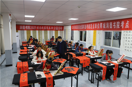 2月3日,記者在鄲城縣潤德書院看到,“我為我家寫春聯(lián)”活動正緊張地進行著,數(shù)十名書法小學(xué)員端坐案前、從容執(zhí)筆、揮毫作書,一個個福字工整又靈活,一副副對聯(lián)娟秀又詩意。孩子們在屋內(nèi)全神貫注地寫字,把最美好的祝福用自己的所學(xué)展示給家庭;家長們在窗外掂腳張望,望子成龍、望女成鳳的心態(tài)表露無遺。