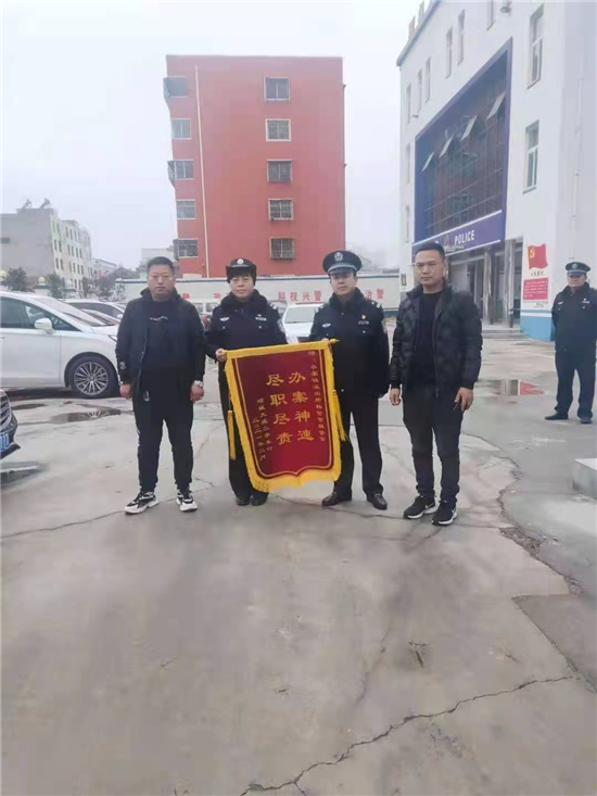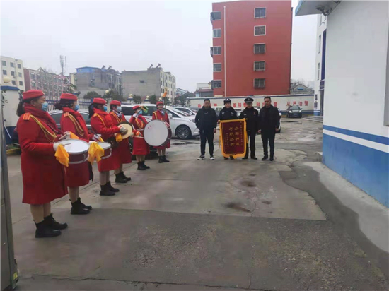 2月25日上午,項(xiàng)城市公安局水寨派出所門口鑼鼓齊鳴,異常熱鬧,兩名男子手持一面寫有“辦案神速、盡職盡責(zé)”字樣的錦旗,送給派出所民警,深表謝意。