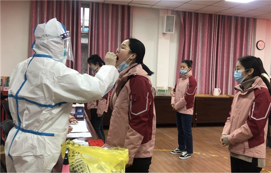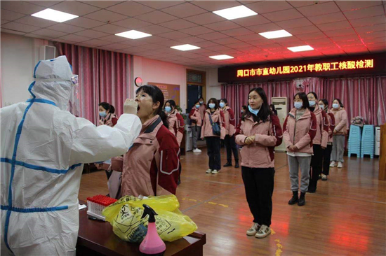為保證市直幼兒園順利開學(xué),按照市教體局統(tǒng)一安排部署,近日,周口市婦女兒童醫(yī)院核酸檢測組對(duì)市直幼兒園全體教職工百余人順利進(jìn)行了新冠肺炎核酸檢測,檢測結(jié)果在校老師全部健康,無異常。圖為市直幼兒園教職工在進(jìn)行新冠肺炎核酸檢測。