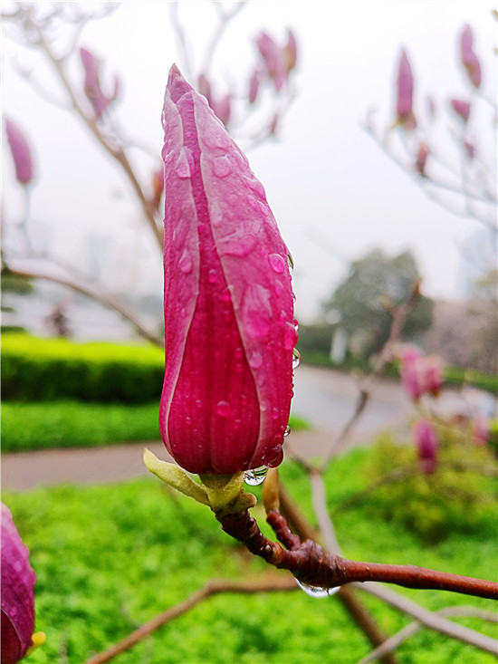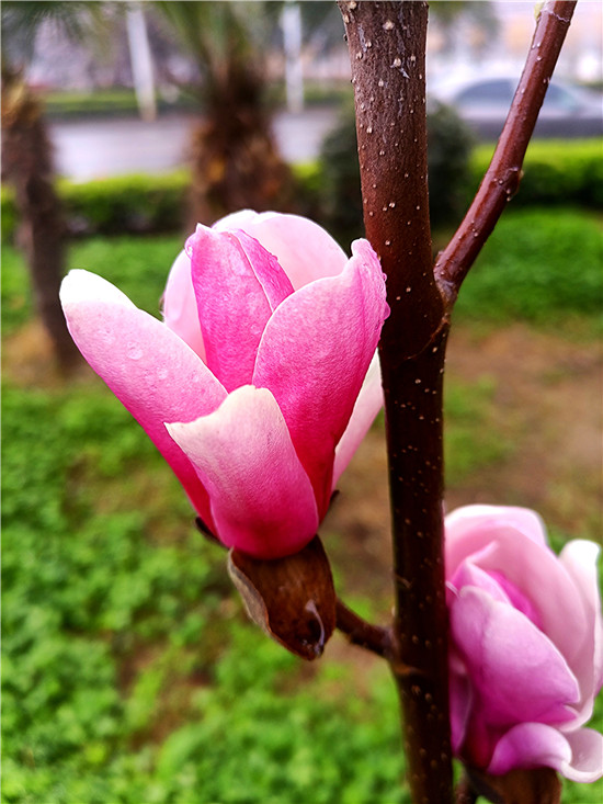 “霓裳片片晚妝新,束素亭亭玉殿春。已向丹霞生淺暈,故將清露作芳塵。”3月11日,我市下了一場小雨,路旁的紫玉蘭更顯晶瑩玉潤,朵朵玉蘭花如雨后新荷般清麗脫俗,或含苞待放、欲語還休,或花瓣盡展、舞姿翩翩,令人不禁駐足欣賞。