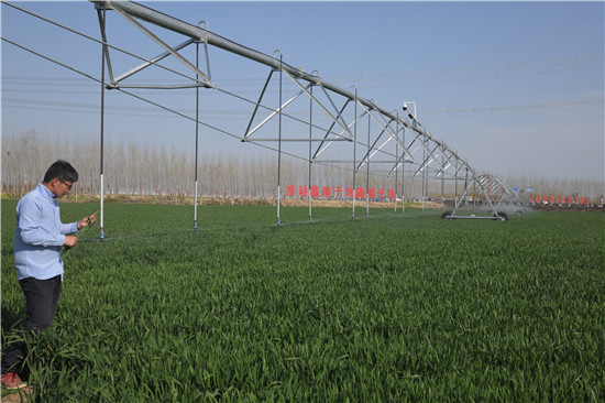 3月28日,商水縣天華合作社調(diào)試中的自走式節(jié)水灌溉設(shè)備正在噴水。