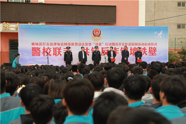 4月18日上午,鄲城縣打擊治理電信網(wǎng)絡(luò)新型違法犯罪“迅雷”行動暨反詐宣傳進校園活動儀式在縣三高啟動??h政府副縣長、公安局長陳鳳祥,縣政府辦公室主任賈培民,縣教體局黨組書記、局長羅明黨等出席啟動儀式,縣打擊治理電信網(wǎng)絡(luò)新型違法犯罪工作各成員單位、縣公安局、縣三高分別組成代表隊2200余人參加啟動儀式,儀式由賈培民主持。