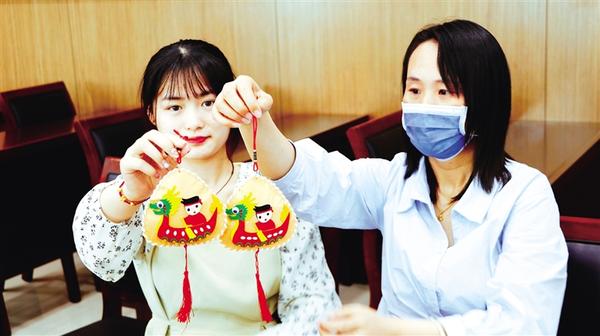6月20日,市城鄉(xiāng)一體化示范區(qū)工作人員展示做好的香囊。當(dāng)日,市城鄉(xiāng)一體化示范區(qū)開展“聞香過端陽 仲夏戴香囊”文明實踐主題活動,從拼龍舟、縫香囊、畫團扇、DIY粽子等一系列活動來沉浸式體驗優(yōu)秀傳統(tǒng)手工藝文化。