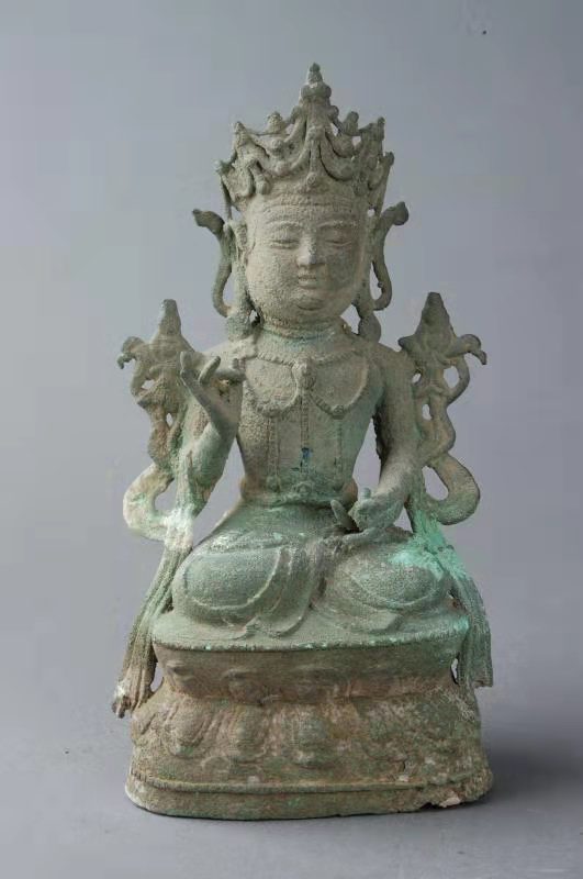 商水壽圣寺塔,高41.5米,為九級(jí)樓閣式磚塔。塔體從底至頂漸收勻稱,平面呈正六邊形。塔頂用鑄鐵鑄成葫蘆形寶頂,給人以挺拔雋秀之感。塔的層檐收放尺寸設(shè)計(jì)精妙,既保護(hù)了塔墻免遭雨雪侵蝕,又使塔體顯得莊重肅穆。塔身諸層外壁皆辟有圓券門(mén)、破子欞假窗,塔身各角砌出倚柱,檐下密布磚雕斗拱。塔內(nèi)砌出塔心室和盤(pán)旋梯道,可逐層登高至塔頂。塔第一層,南面辟門(mén),門(mén)楣上刻“明道二年癸酉歲三月一日丙寅時(shí)戊寅日,葬舍利院主。僧□□建□□功德塔”。說(shuō)明建塔的年代是北宋。塔室為穹窿頂。東南、西南兩壁有破子欞盲窗各1個(gè),西壁另辟一拱券門(mén),有踏道可登至第二層塔心室。第二層,南面辟門(mén),東南、西南兩壁各砌一盲窗,東壁另辟一門(mén)可沿踏道進(jìn)入第三層。以上諸層大同小異。第四層,塔心室內(nèi)北墻嵌石雕佛像3尊,兩尊盤(pán)膝正面像,一尊盤(pán)膝背面像。剎柱下端插入塔心室,上端置鐵質(zhì)寶瓶,在不同部位還發(fā)現(xiàn)“風(fēng)調(diào)雨順”“國(guó)泰民安”“周王千歲千千歲”“大明嘉靖二十八年九月吉日”“河南周府施舍西華小瑤集壽圣寺塔一座”等字樣,這些都說(shuō)明了明代嘉靖年間,又重修了塔身。1998年9月,在維修該塔時(shí),在天宮清理出明代銅佛像3尊,白釉瓷盤(pán)1只,白釉黑花瓷碗、白釉褐花瓷碗各1個(gè),刻印大彌陀經(jīng)1卷。銅佛像高約20厘米,其中一尊有“嘉靖三十一年”字樣,這一時(shí)期的周王為周敬王朱在鋌,這說(shuō)明嘉靖三十一年周敬王朱在鋌為祈福曾將這批器物和經(jīng)卷,置入了塔頂?shù)蔫F質(zhì)寶瓶中。