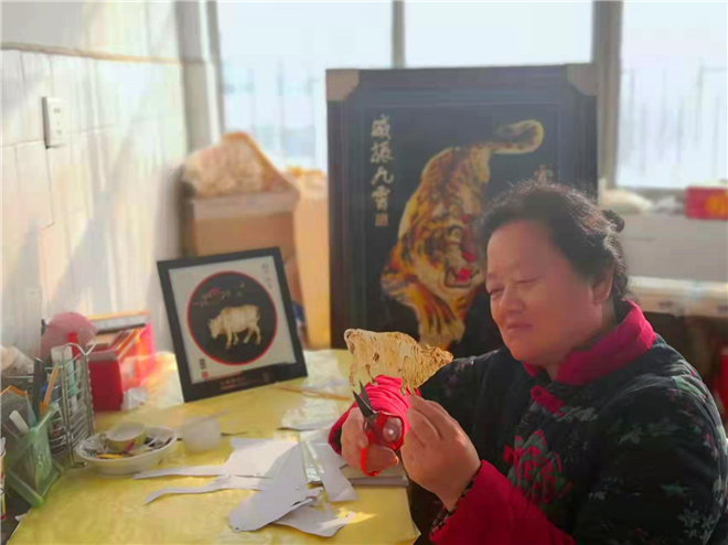 “虎在中國是極其有力量的動物?!?月25日,秸稈畫技藝代表性傳承人、中國民間文藝家協(xié)會國家級會員王春梅告訴記者,她耗時近半年創(chuàng)作的秸稈畫《威震九霄》已完成。記者看到,作品中的老虎長半米有余,威風凜凜、活靈活現(xiàn),用平面的方式展現(xiàn)了立體的效果?!?022年是虎年。在古代,老虎就以威風凜凜的形象被視為勇氣的象征,來表現(xiàn)軍人的勇敢和堅強。古時候關(guān)于將士大臣的美譽就有虎將、虎臣、虎士等?!蓖醮好氛f。