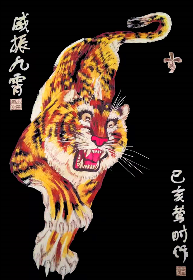 為了慶祝虎年,王春梅創(chuàng)作的秸稈畫主要有《威震九霄》《虎之王者》《飛天神虎》等,此外,她還創(chuàng)作了兩幅剪紙作品,分別是《虎年組圖》和《虎之2022》。和剪紙作品相比,秸稈畫制作工序更加復(fù)雜,全憑手工完成,充分利用秸稈本身的紋理和質(zhì)地,結(jié)合顏色、溫度的變化,將畫面立體的呈現(xiàn)出來。其中,她創(chuàng)作的部分作品結(jié)合了唐卡的相關(guān)風格和顏色配比,比如《威震九霄》中虎的形象所表現(xiàn)出來的力量感借鑒了唐卡中護法的力量感;《虎之王者》和《虎之2022》中對于藍色的運用結(jié)合了唐卡中的藍色,代表了永恒不變,如同穹蒼攬護萬物之意。