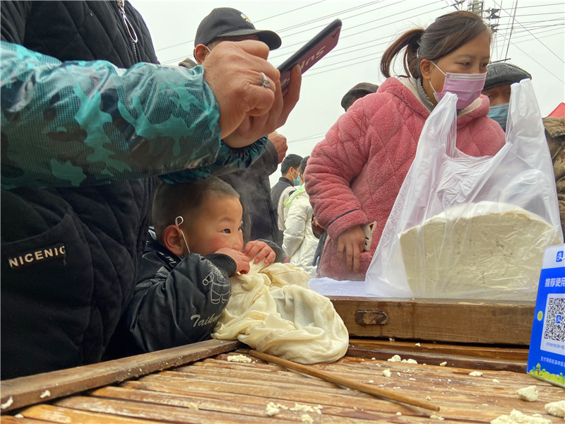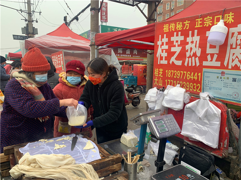 在固墻鎮(zhèn)的集市上,“桂枝熱豆腐”攤位前的顧客絡(luò)繹不絕?!敖o我來50塊錢的豆腐”“我要20斤,先給我切豆腐吧”“我要30斤,多少錢”……人群將豆腐攤里三層外三層圍了起來,從人群外朝里看看不見豆腐,只看到豆腐攤里冒出來的團(tuán)團(tuán)熱氣。“等了半個小時了,剛才那一盒豆腐沒輪到我就賣完了,這才搶到手?!备浇拇迕駰畲鬆斈弥鴦傎I的豆腐高興地說。“我從鹿邑來的,姐姐在里面擠著買豆腐,我在這兒等她呢?!?歲的張家瑞說,她每年放寒假都會和家人一起到固墻來探親,過年的時候逛逛集市,順便買些豆腐帶回鹿邑。