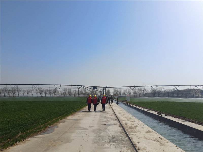 放眼望去,一座座白色的標(biāo)準(zhǔn)化通電機(jī)井房坐落在麥田地頭,源源不斷的井水流進(jìn)蓄水池里,不斷冒出歡快的水花。一旁的大型電動(dòng)平移式噴灌機(jī)把井水過濾后,澆灌出一片片盎然綠意。遠(yuǎn)處身穿紅馬甲、頭戴安全帽的供電檢修人員正在對(duì)抽水專變進(jìn)行認(rèn)真細(xì)致地檢查。