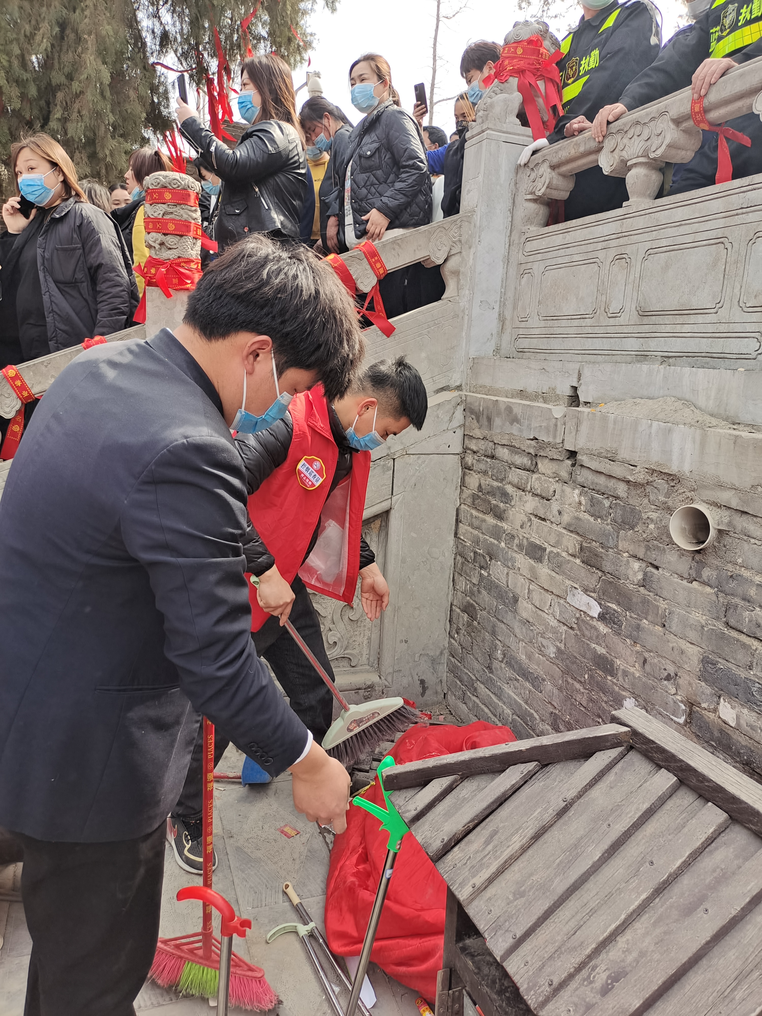 在伏羲陵墓后的蓍草園周圍,有人買紅布條系在欄桿上祈福,有人虔心祝禱。當蓍草成為聚焦點時,有人卻拿著打掃工具默默清理垃圾,讓蓍草園成為一方“凈土”。見他們身穿紅馬甲,記者上前詢問,原來是來自建業(yè)物業(yè)的志愿者,其中一名叫李小宇,他說太昊陵已經(jīng)成為淮陽門面,要做好衛(wèi)生,把太昊陵的良好形象維持住。“我們都是自愿前來,讓家鄉(xiāng)父老不論啥時候都看到一個干干凈凈的太昊陵!”李小宇說。