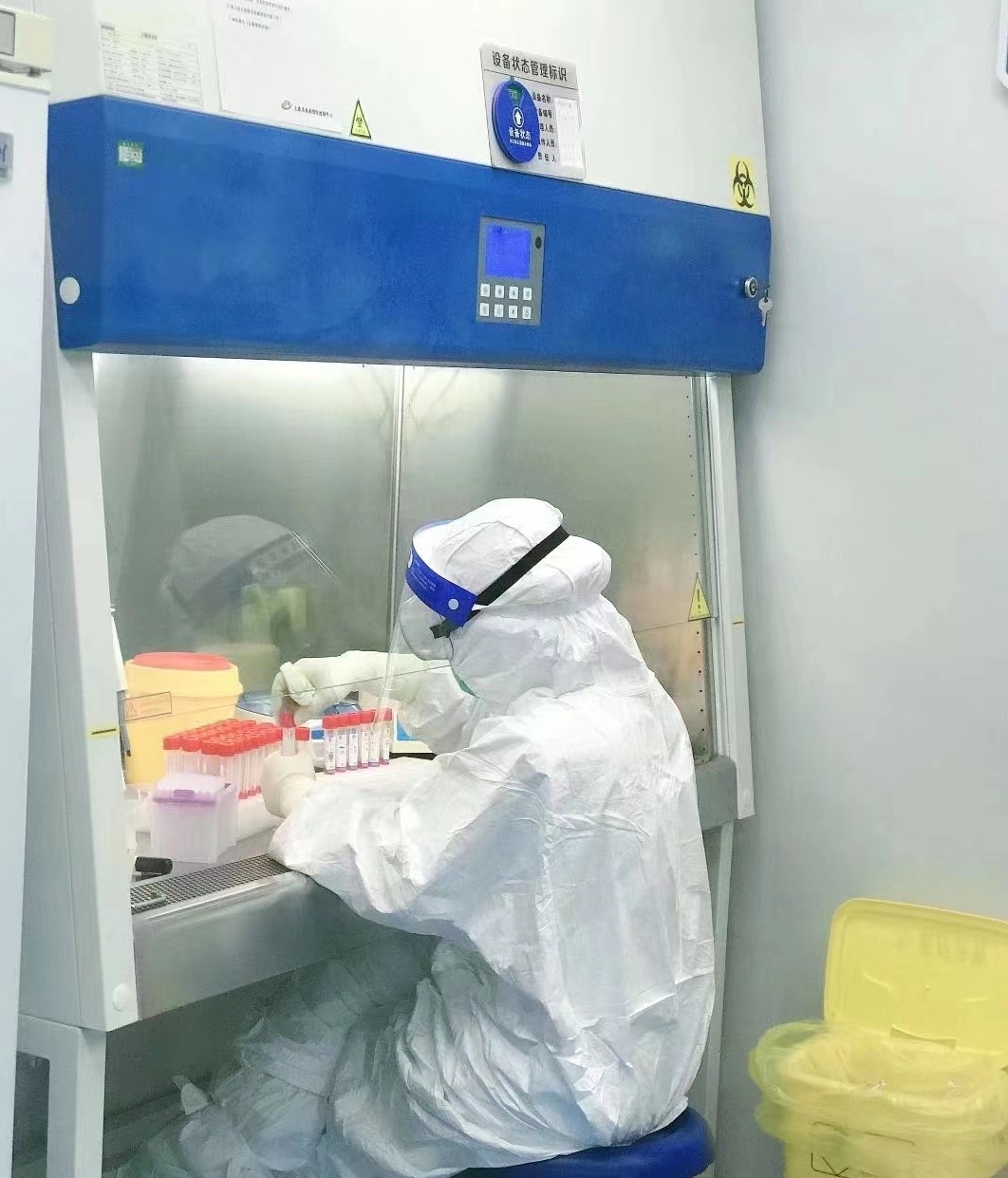 實(shí)驗(yàn)室的三級(jí)防護(hù)包括穿著連體防護(hù)服,戴N95口罩、雙層手套、鞋套和護(hù)目鏡。由于核酸檢測(cè)不同于其他檢測(cè),PCR 實(shí)驗(yàn)室里機(jī)器不間斷運(yùn)行,即使開著空調(diào),室內(nèi)溫度也有27℃~28℃。密不透風(fēng)的防護(hù)裝備一穿就是6個(gè)小時(shí)~8個(gè)小時(shí),感染風(fēng)險(xiǎn)大、操作過程長(zhǎng),每次結(jié)束工作,姜等等渾身都會(huì)被汗水浸透。核酸提取、體系配制、擴(kuò)增檢測(cè)……每道程序背后,都充滿了高風(fēng)險(xiǎn)。接收的樣本有鼻咽拭子,鼻咽拭子直接震蕩混勻處理,取一定量到核酸提取板,提取完成,加一定量提取液到透明的八聯(lián)管內(nèi),每一步都要做到無(wú)一缺漏。